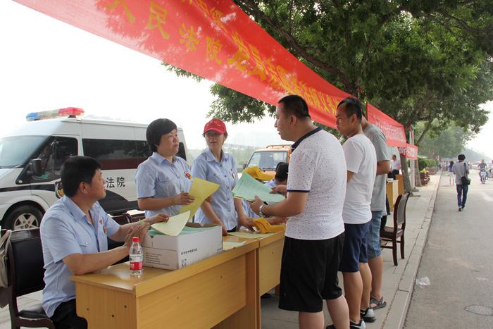 6月27日,衡水中院组织刑事、民事、执行等数十名法官志愿者组成宣传队,主动热情地向过路群众发放包括婚姻法基本常识、刑事诉讼法小知识、民事诉讼风险提示书、诉讼明白纸等内容的宣传单。