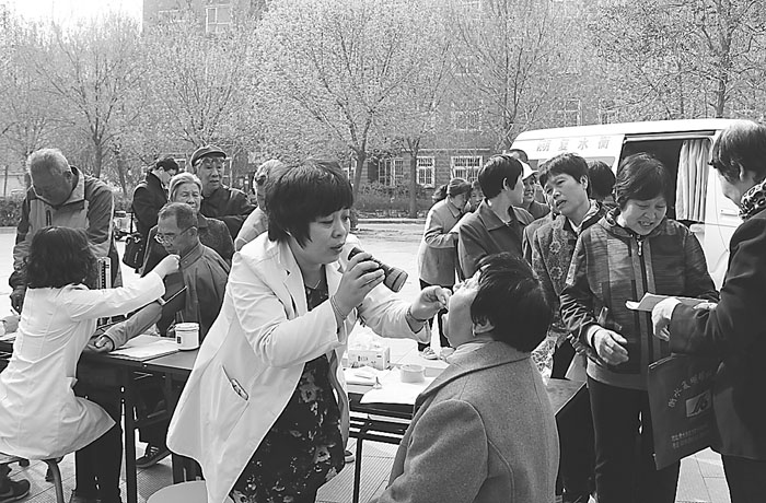 为提高辖区居民健康知识水平,日前,衡水市桃城区路北街道华庭社区与复明眼科医院携手免费为社区居民开展视力、耳、鼻、喉检查,受到了广大社区居民的好评。图为体检现场。 赵淑玉蔡海峰摄