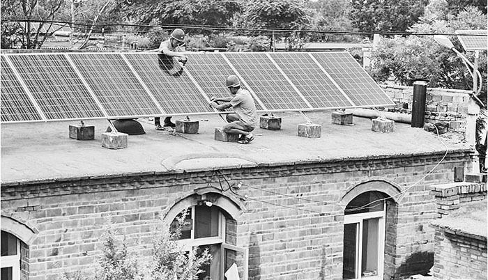 ![]() 施工人员正在为贫困户安装光伏发电太阳板。