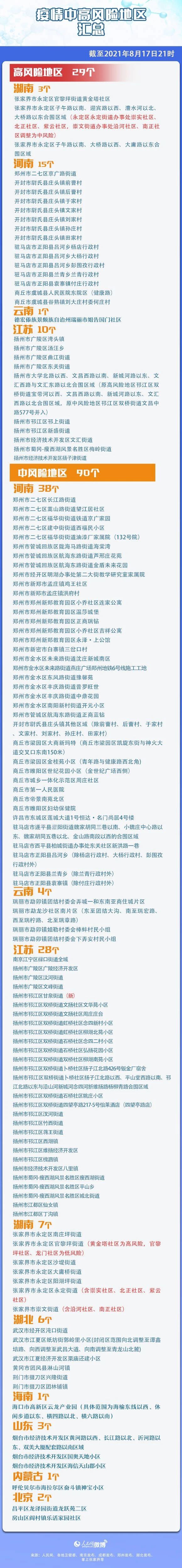 截至8月17日21时,全国有29个高风险地区,90个中风险地区。