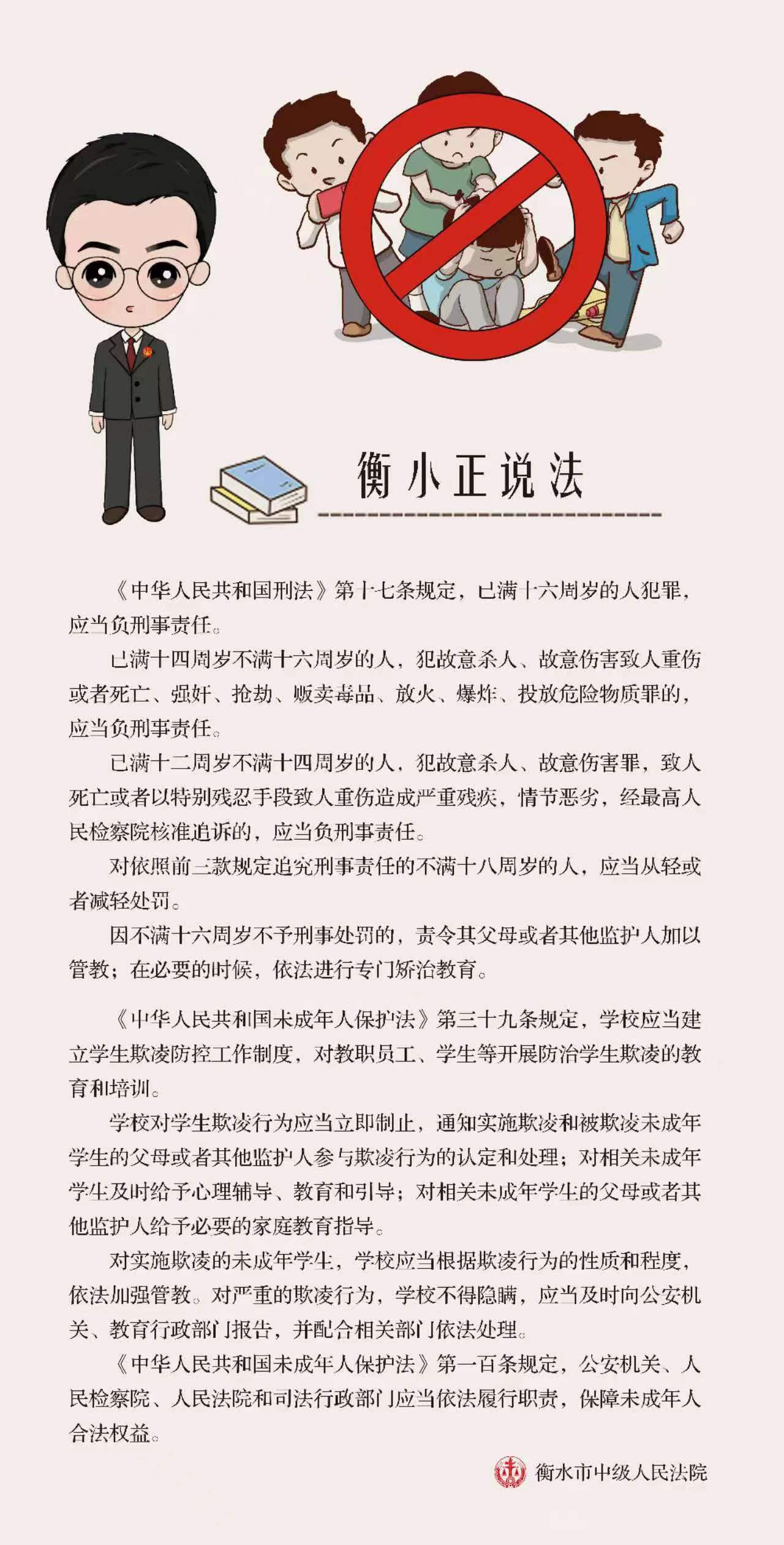 《中华人民共和国刑法》第十七条规定,已满十六周岁的人犯罪,应当负刑事责任。已满十四周岁不满十六周岁的人,犯故意杀人、故意伤害致人重伤或者死亡、强奸、抢劫、贩卖毒品、放火、爆炸、投放危险物质罪的,应当负刑事责任。已满十二周岁不满十四周岁的人,犯故意杀人、故意伤害罪,致人死亡或者以特别残忍手段致人重伤造成严重残疾,情节恶劣,经最高人民检察院核准追诉的,应当负刑事责任。对依照前三款规定追究刑事责任的不满十八周岁的人,应当从轻或者减轻处罚。因不满十六周岁不予刑事处罚的,责令其父母或者其他监护人加以管教;在必要的时候,依法进行专门矫治教育。《中华人民共和国未成年人保护法》第三十九条规定,学校应当建立学生欺凌防控工作制度,对教职员工、学生等开展防治学生欺凌的教育和培训。学校对学生欺凌行为应当立即制止,通知实施欺凌和被欺凌未成年学生的父母或者其他监护人参与欺凌行为的认定和处理;对相关未成年学生及时给予心理辅导、教育和引导;对相关未成年学生的父母或者其他监护人给予必要的家庭教育指导。对实施欺凌的未成年学生,学校应当根据欺凌行为的性质和程度,依法加强管教。对严重的欺凌行为,学校不得隐瞒,应当及时向公安机关、教育行政部门报告,并配合相关部门依法处理。