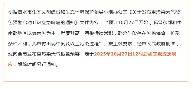 深州市定于10月27日12时启动重污染天气Ⅱ级应急响应!