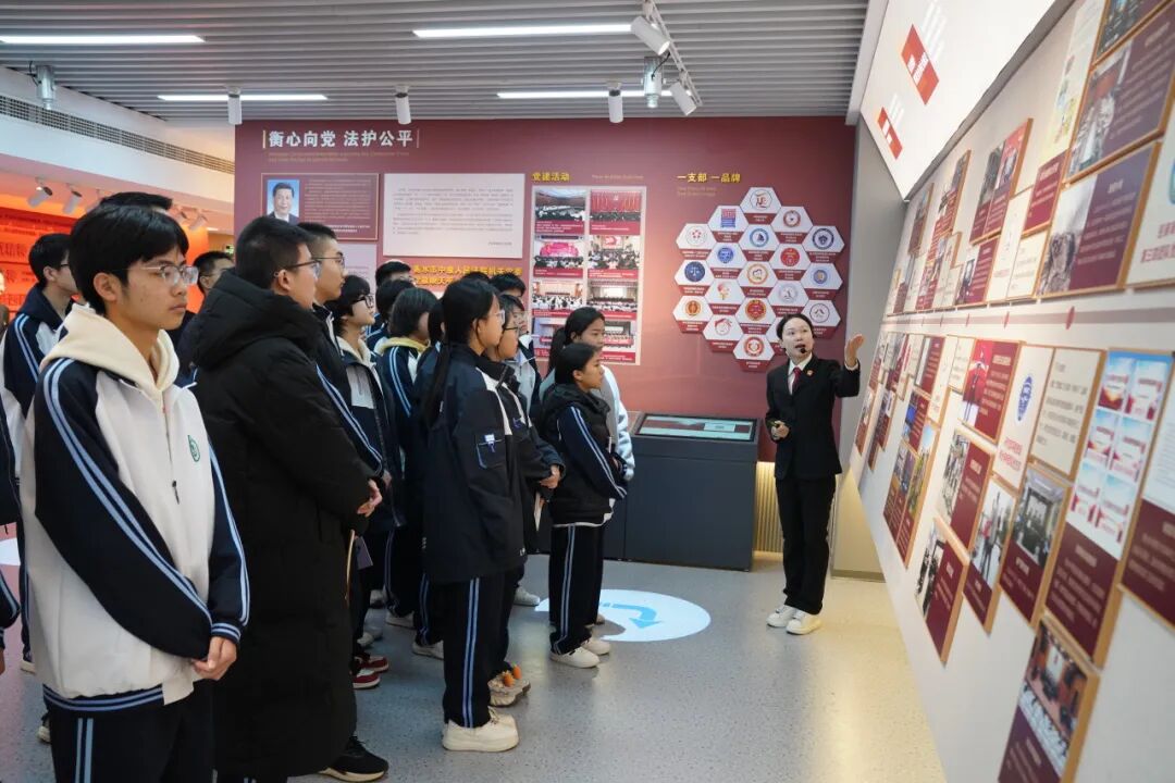 在法院干警的引导下,学生们先后参观了衡水中院党建实训基地、大要案审判庭、青少年法治基地。走进党建实训基地,讲解员讲述革命先辈的法治故事,带领学生真切感受党领导法治建设的辉煌历程,让学生在法治故事中深刻感悟“努力让人民群众在每一个司法案件中感受到公平正义”目标中蕴含的法院担当;在大要案审判庭,讲解员结合法庭布局,向学生介绍刑事案件庭审的基本流程与规范,带领学生走进庄严的法庭,让学生切身感受到司法审判程序的公正与严谨;走进青少年法治教育基地,讲解员结合青少年身心发展规律,重点解读与青少年权益相关的热点问题,引导学生学会运用法律武器维护自身合法权益。