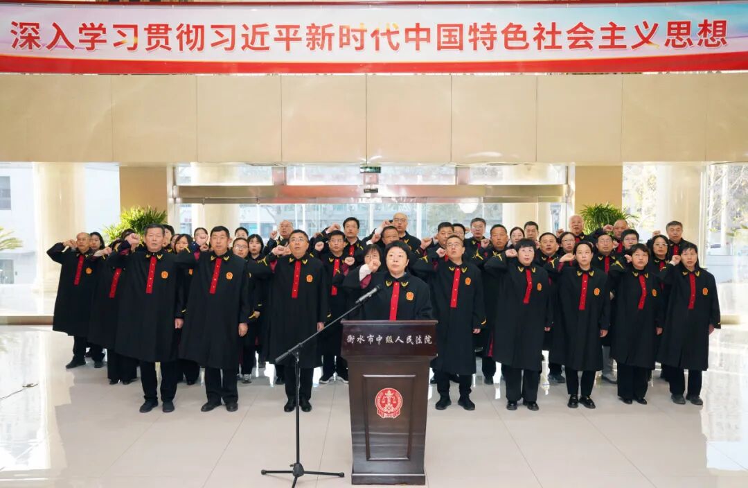 宪法之光,照亮法治征程;铮铮誓言,凝聚司法力量。为深推动宪法深入人心,近日,衡水中院组织全体员额法官举行宪法宣誓活动,以庄严仪式向宪法致敬,向法治承诺。衡水中院党组书记、院长王靖出席仪式并领誓,党组成员、副院长高辉主持仪式。