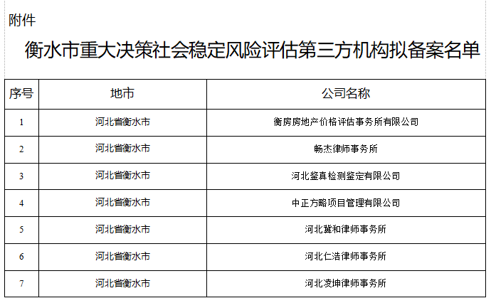 衡水市重大决策社会稳定风险评估第三方机构第二批拟备案名单公示