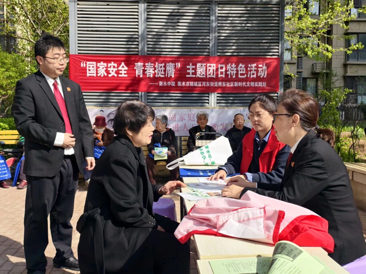 “国家安全无小事,法治防线靠大家!今后我们一定会更主动参与维护国家安全,用实际行动守好这道关。”4月11日,衡水中院干警与桥东社区志愿者在依云湾小区联合开展“国家安全 青春挺膺”主题宣传活动,通过悬挂宣传条幅、发放宣传彩页、现场讲解案例等方式,向过往群众普及国家安全知识,用通俗易懂的语言重点讲解国家安全法、网络安全法等与群众生活息息相关的法律法规,引导群众树立懂法守法的思想观念。